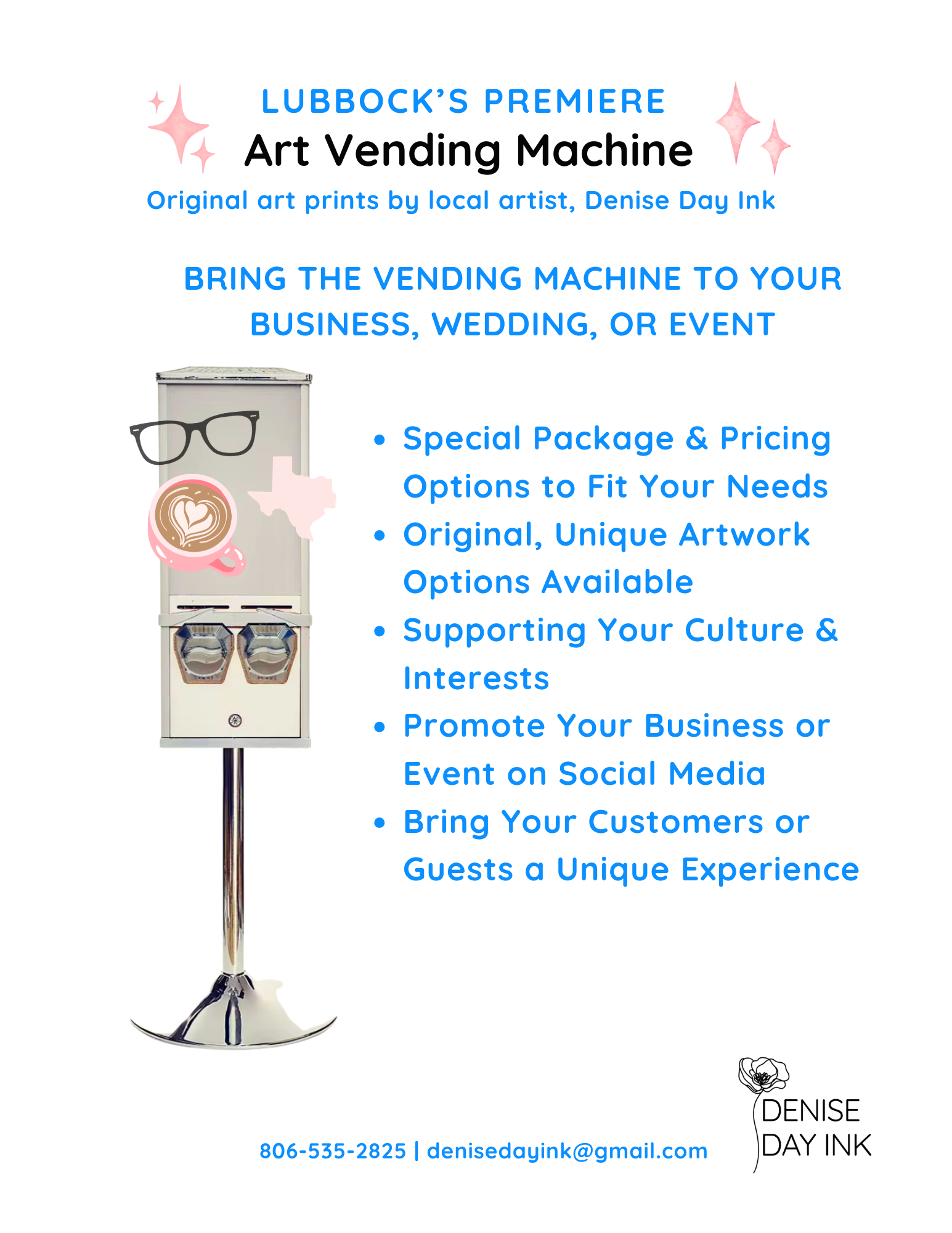 Visit the machine at local Lubbock shops, request a machine for your shop, or rent for an event or wedding.
